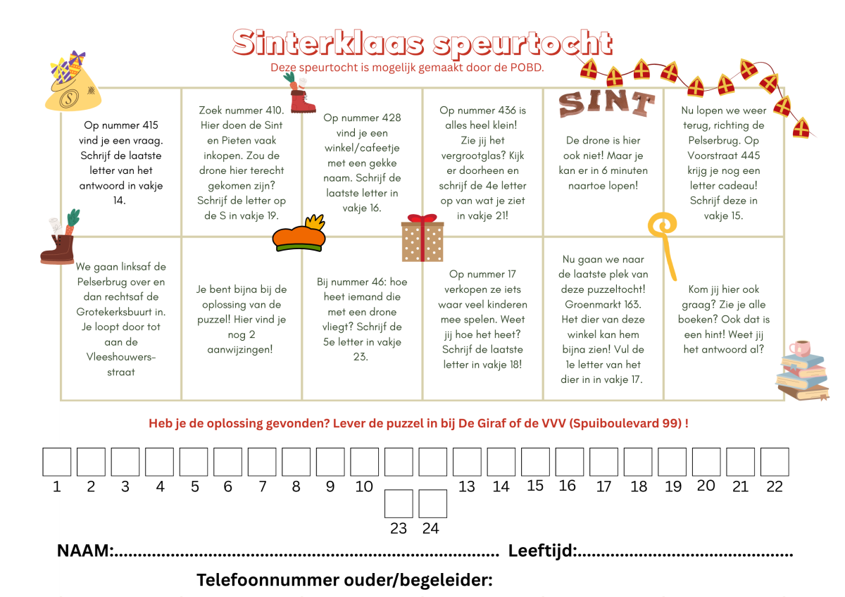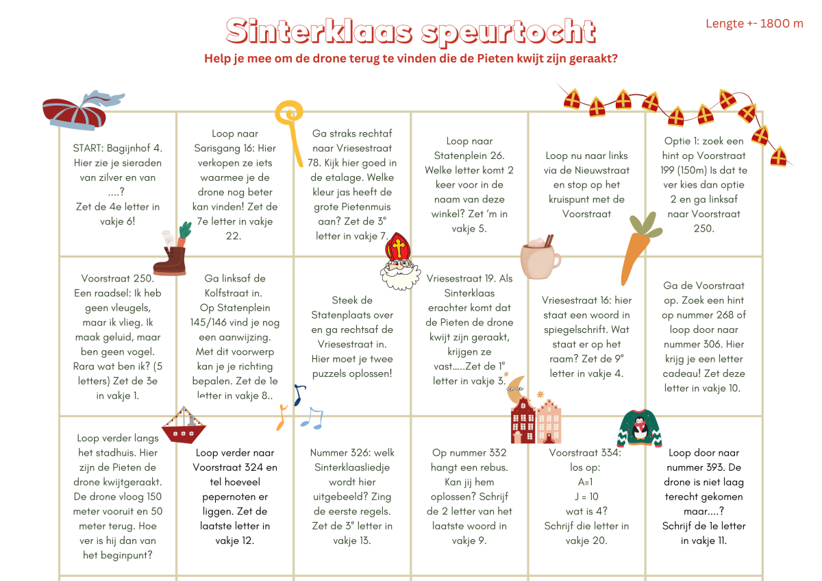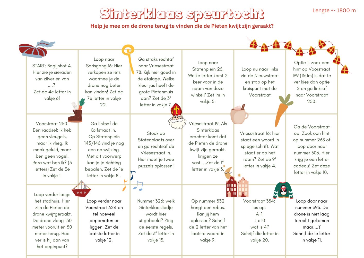 Help jij de Pieten om de Verdwenen Drone weer terug te vinden? Bekijk de video van de ondeugende Pieten en download je speurtocht op www.pobd.nl. Voor de kleinere kinderen vind je hier ook een leuke kleurplaat. De speurtocht en kleurplaat is mogelijk gemaakt door de ondernemers van de binnenstad. Tot en met 3 december kan je ze inleveren bij de brievenbus van Sinterklaas, die staat bij de VVV (Spuiboulevard 99).