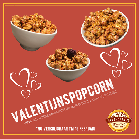 Allenbrand’s gaat vanaf dit weekend hun speciale Valentijnspopcorn maken. Caramel popcorn gecoat in Belgische witte chocola en daar bovenop frambozenpoeder en een chocolaatje in de vorm van een framboos! Een zoete smaak met een verfrissende friszure bite!