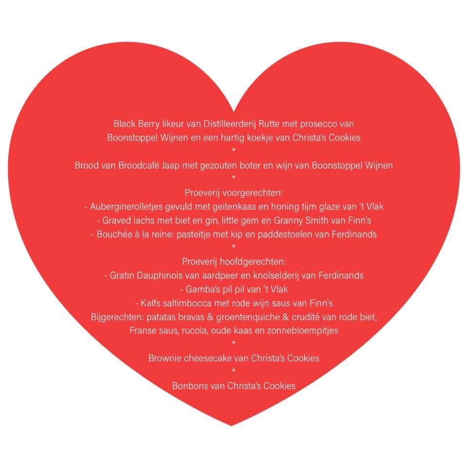 Met iets lekkers vooraf van wijnhandel Boonstoppel, Rutte en Christa’s Cookies. En maar liefst 2 proeverijen: één met lekkere voorgerechten en één met heerlijke hoofdgerechten van Finn’s, ’t Vlak en Ferdinands. Je liefdesdiner sluit je af met bonbons en een brownie cheesecake van Christa’s Cookies. Bestellen kan bij elke deelnemende zaak. Wees er wel snel bij want het aantal is beperkt!