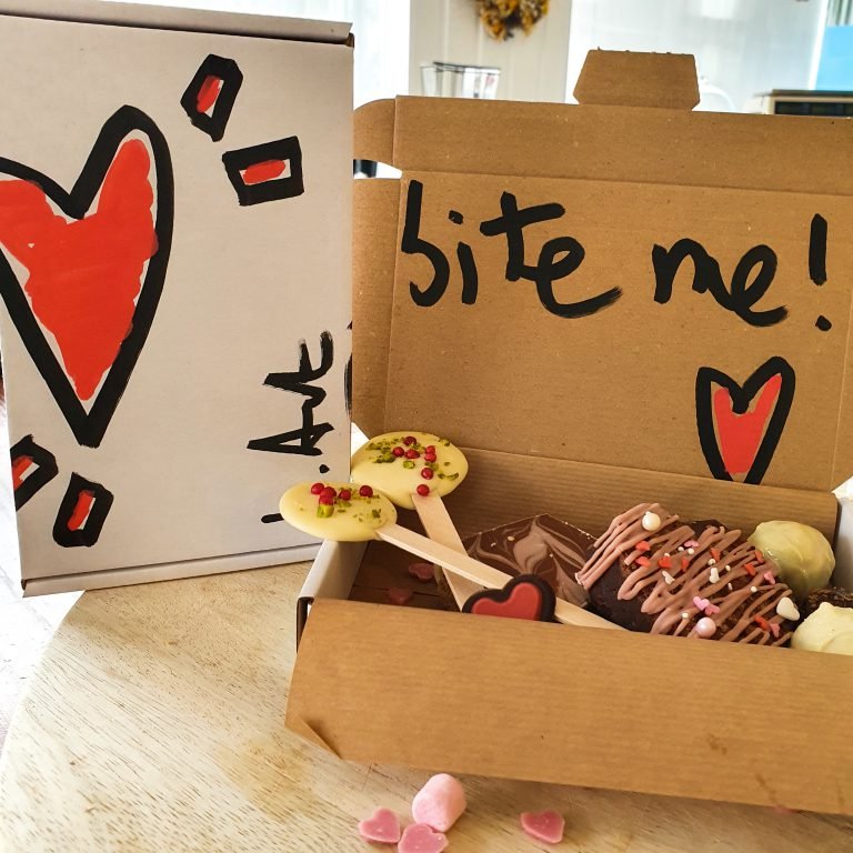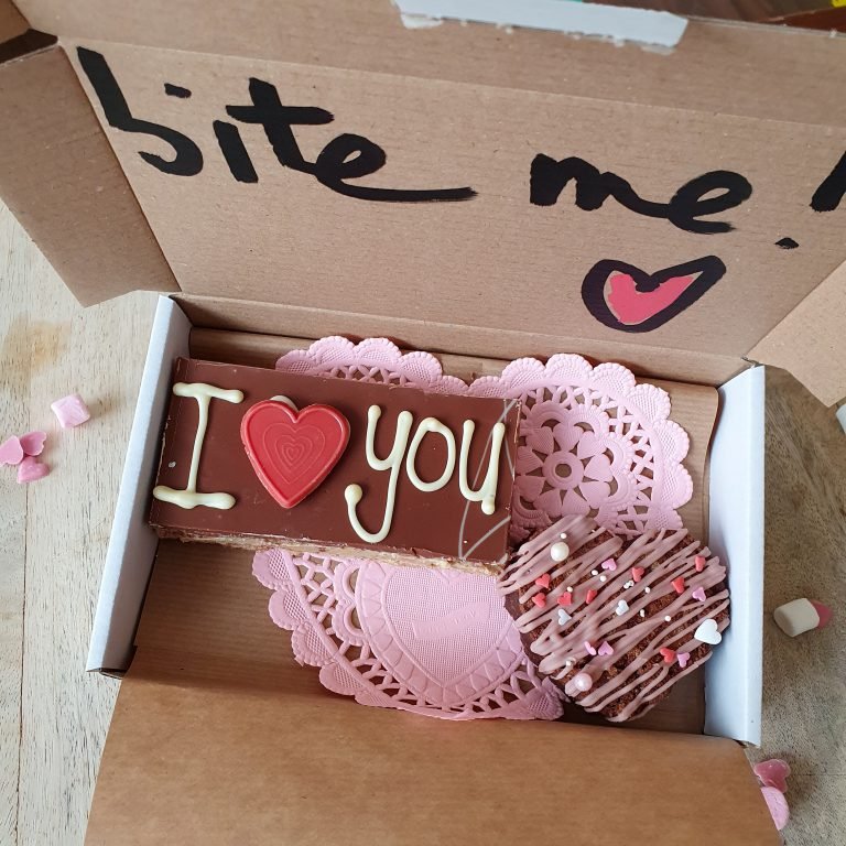 Of kies voor Verras je Valentijn per Post. Dit superleuke pakket zit in een door B.art gepimpte box en wordt verzonden naar jouw Valentijn. Inhoud: Valentijns millionaireslice, hartvormige brownie, 2 witte chocoladelollies en Christa’s cookies chocolade truffels. Bestellen kan hier.